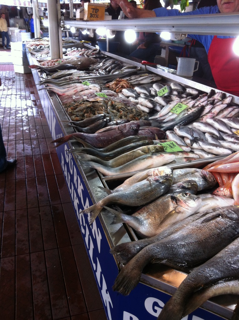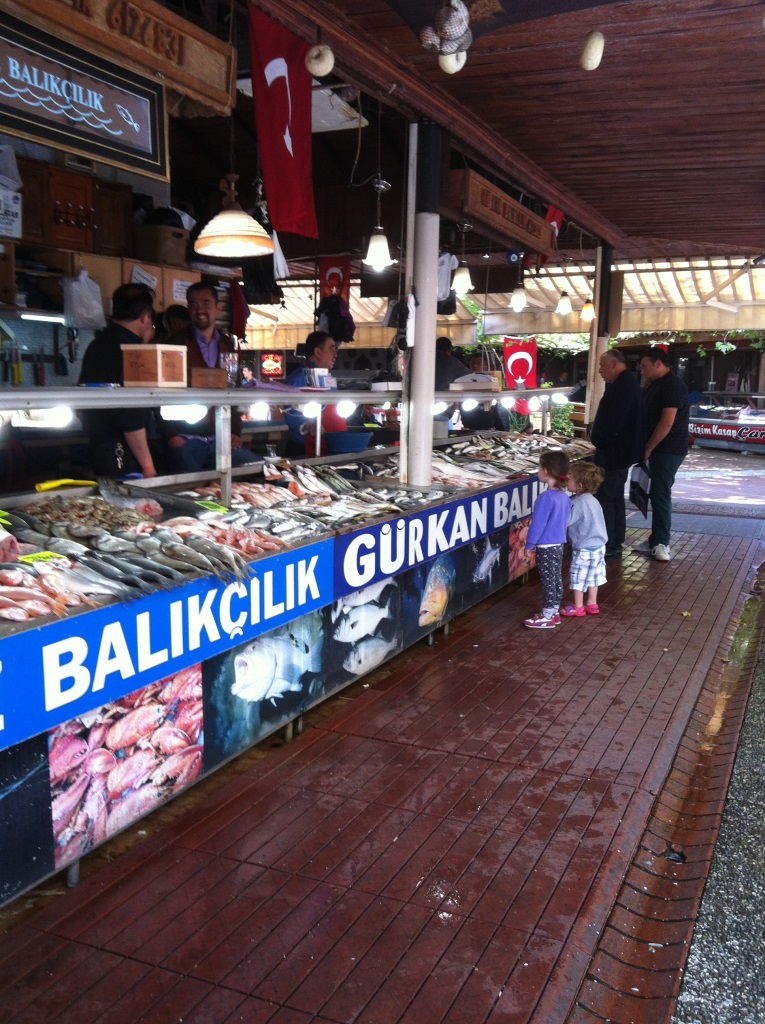 אבל בינתיים, אנחנו כאן בfetiye, ולמרות ״ההפתעות״ שחיכו לנו החלטנו לשמור על מורל גבוה, ואם אתה בfetiye שהיא עיר קסומה ומאוד ריחנית מתבלינים ותשוקתית מרצועת חוף מדהימה ולוקום מ- ו – ש- ל- ם!! אין דרך טובה יותר להרים את המורל מארוחת דגים טובה בשוק הדייגים של פטיה. אני אישית מעולם לא ראיתי את עצמי אדם של דגים. תמד הייתי אדם של בשר, אבל פטיה בהחלט שינתה את המצב מבחינתי. המבחר העצום של הדגים ופירות הים שמגיעים מהים (אפשר ממש לראות איך הדייגים מביאים את הסחורה לדוכנים תוך כדי אכילת הארוחה) והמסעדות הנהדרות השוכנות בצמוד לדוכני השוק מזכה את המבקר בחוויה נהדרת של רכישת הדגים או פירות הים בדוכן השוק והבאתם לאחת המסעדות שמקיפות את הדוכנים. הדגים מרהיבים, באיכות גהוהה ביותר בשלל גדלים. השוק נקי ומתוחזק היטב כך שאין ריח לא נעים של דגים טריים (למי שסובל מגועל ריחות , כמוני) וחוויית הארוחה שם היא עריבה לחיך ומרוממת נפש. שרימפסים ג׳מבו ברוטב עגבניות חמאה שום וצ׳ילי חריף, קלמרי בשום וצ׳ילי, ברבוניות וסרדינים מטוגנים בלימון ופלפל חריף,סלטים ירוקים טריים, מלא בצל ירוק, טחינה ערימות פטרוזיליה ופלפלים ירוקים חריפים צלויים בגריל וכמובן הraki (שהוא הגירסה המעודנת של העארק והאוזו) זו כבר חגיגה שלמה. אז ישבנו לנו משפחתנו הקטנה והחמודה, שולחן עמוס בכל טוב, אנשים שמחים סביבנו שלישיית טרבוקות מסתובבים בין השולחנות, ואוכל טעים בטירוף סביבנו, וקבענו: עם כל הכבוד למנוע שבור של מפרש, רדיו שניזוק ולא ברור מהו עתידו ומקומו- זה המסע שלנו, והוא לא נמדד ביום אחד, וגם לא בשבוע וגם לא בתקלות טכניות, שהן חלק בלתי נפרד ממסע על יאכטה- עכשיו אנחנו אוכלים ונהנים, והילדים שלנו מדלגים מאושר וצועקים maraba (שלום בטורקית) לכל עבר- ואוכלים לוקום שוקולד וקוקוס ( איך זה שאף פעם לא אהבתי לוקום?!?! זה דבר כל כך טעים וממכר).